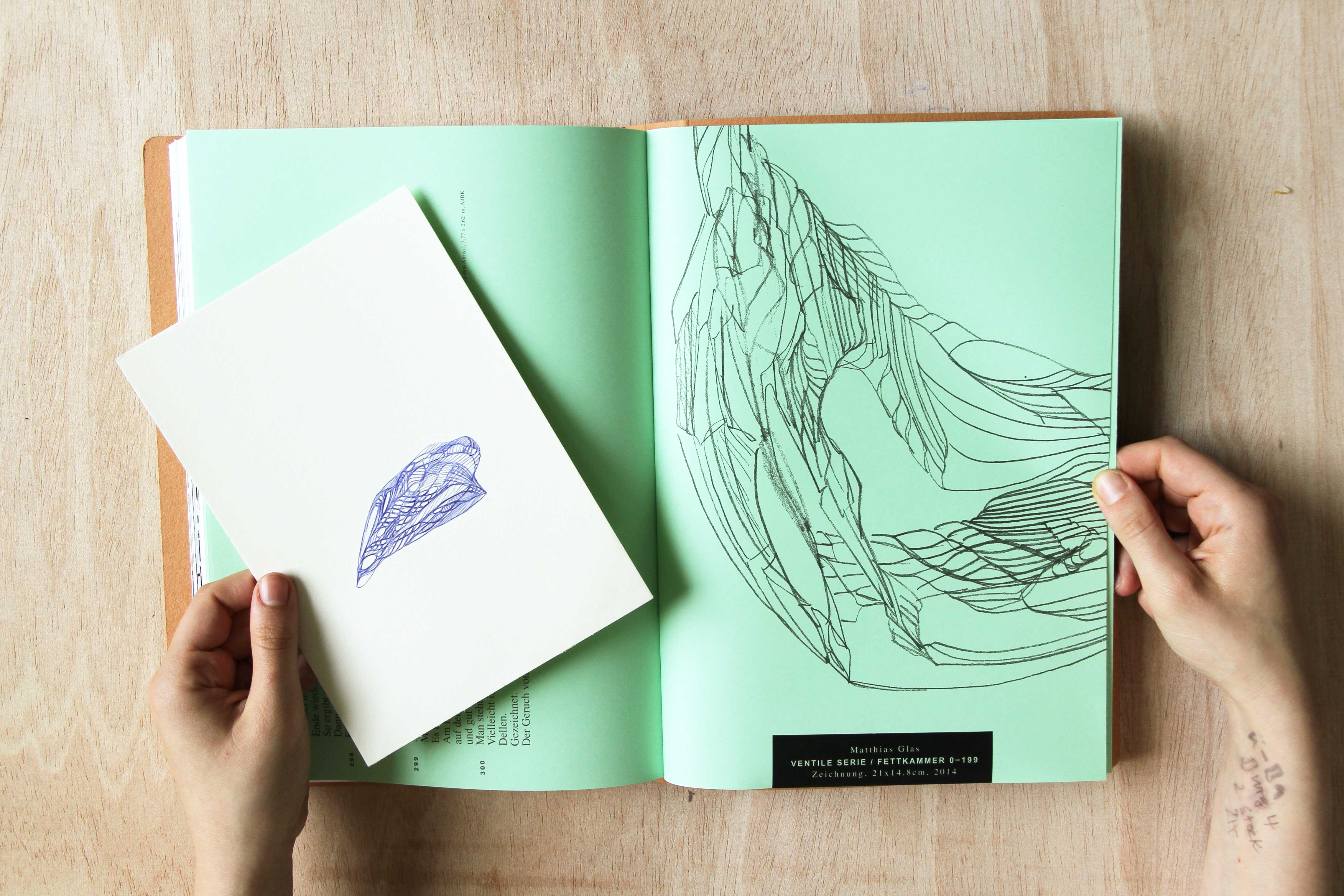 The artist's book “Die Chronologie der Zelle“ shows and analyzes the cyclic working process of sculptor Matthias Glas. 80 pages covering a photo spread of art works are completed by a text section which takes up the preceding flow of images based on a chain of the artist`s thoughts. Additional meta text passages structure the workflow into chapters and give further information on the artistic practice. Each book has an individual screen-printed cover and includes an original drawing by Matthias Glas.