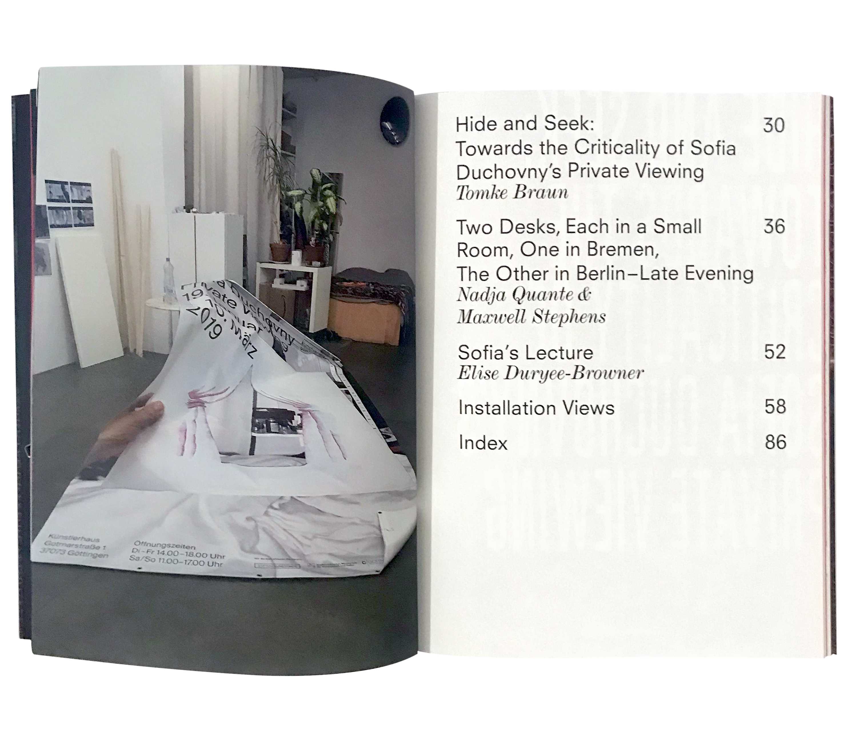 The artist book Private Viewing was conceived as an extension to Sofia Duchovny’s solo exhibition at Kunstverein Göttingen in 2019. With the help of melodramatic references and a sense of humor, Duchovny is blurring the lines between privacy, exposure, and authenticity working towards an „acted reality“. This is also conveyed in the publication, as it is not merely a reproduction of the exhibition but rather begins where the former has ended, opening another chapter of the artist’s practice.