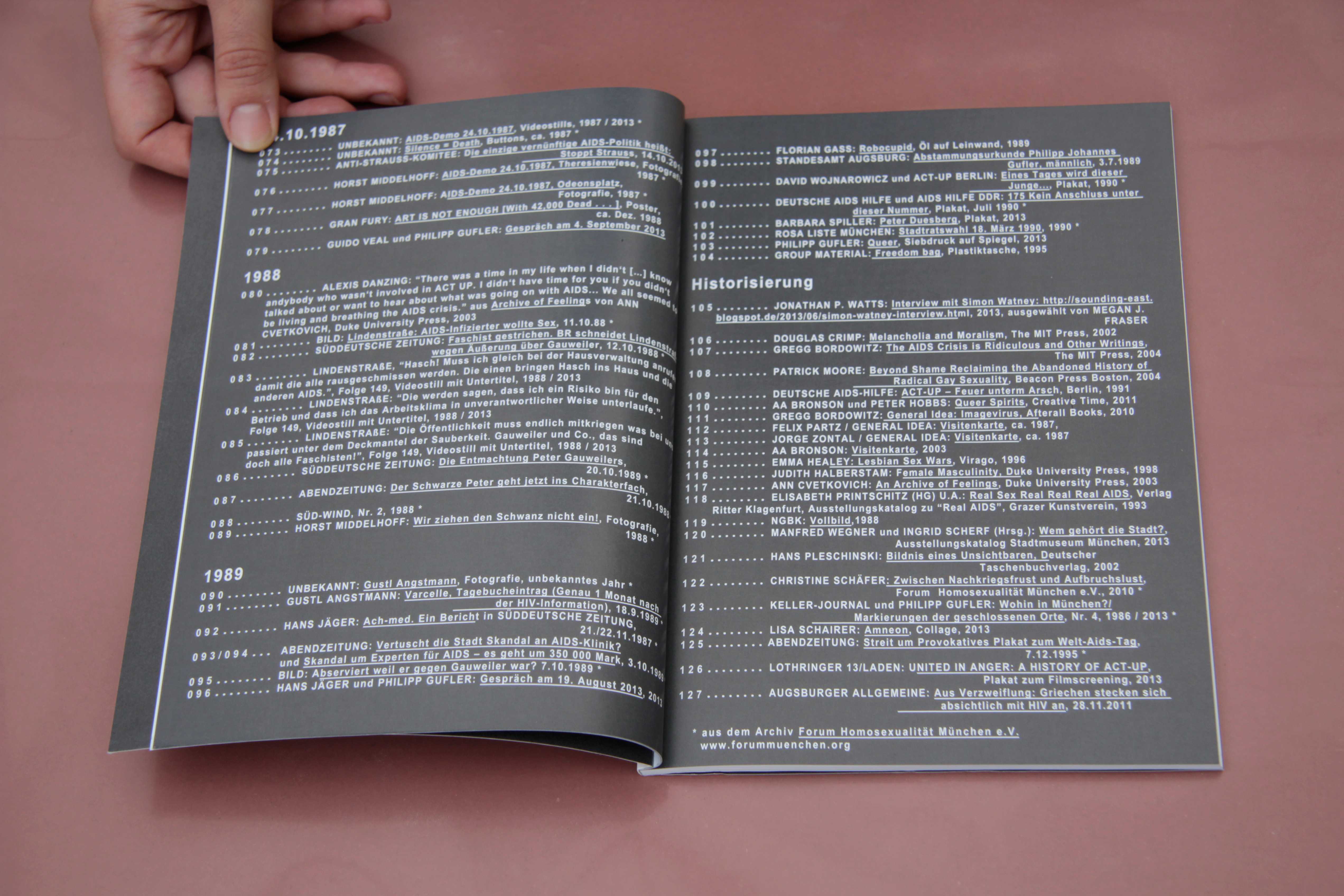 Since 1999, the archive forum homosexualität münchen e.v. has been collecting documents on gay and lesbian movements in Munich. Artist Philipp Gufler focused his research on the AIDS-crisis and the repressive politics in Munich during the 80ies. In his video-installation and the accompanying artist’s book “Projektion auf die Krise. Gauweilereien in München”, documentary material opposes artworks of friends to update and comment on the historical.